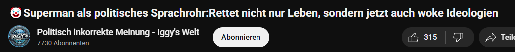 Ja, der neue Superman-Film aus 2025 ist laut den Antiwokes nun woke. Warum? Weil – kein Scherz – Superman sich selbst in dem Film als Migrant bezeichnet hat. DAS ist absolute Wokeness für diese kognitiv unmöblierten Vollzeit-Goofies. Für alle, die es nicht glauben, hier eine Quelle: Einer der etwas größeren Antiwoke-Youtuber: