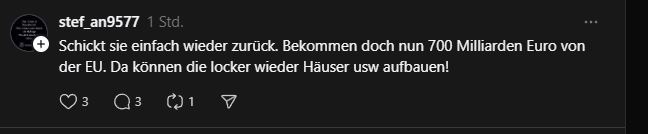 Dabei lässt man aber bewusst außer Acht, dass die Menschen nicht wegen vermeintlicher Armut herkommen – nicht, weil sie Sozialgelder abstauben wollen. Sondern sie flüchten vor einem KRIEG. Sie flüchten, weil ihre Heimat angegriffen wird, ihr Heim zerstört wurde/wird. Und Neid-Dieter hasst sie, weil sie einen SUV fahren, den sie vielleicht eben mitgenommen haben, während ihr Haus kaputt geschossen wurde.