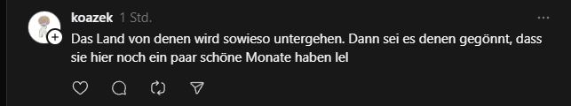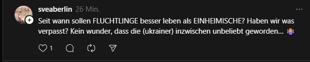 Und gerade hier in Deutschland gibt es zahlreiche Neid-Dieters und Neid-Barbaras, die nur zu gerne gegen jegliche Flüchtlinge hetzen, während sie Faschisten wählen. Und diese Neid-Dieters und Neid-Barbaras kotzen ihren Neid gegen ukrainische Flüchtende auch leidenschaftlich ins Netz.