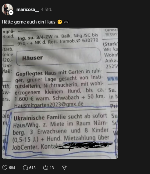Solche Posts gibt es seit Kriegsbeginn immer wieder. Entweder solche Wohnungsgesuche oder auch mal Fahrzeuge. Besonders beliebt sind dabei teuer aussehende Fahrzeuge mit ukrainischen Kennzeichen. Ziel dabei: Stimmungsmache. Gerade bei den Fahrzeugen will man suggerieren: „Denen geht es doch gut, die fahren so teure Autos.“